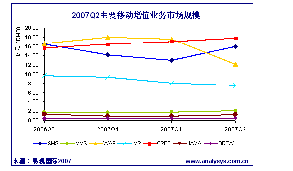 易觀國際研究表明,2007年第2季度移動增值服務(wù)整體市場規(guī)模為57.42億元,同比下降2.33%。其中彩鈴業(yè)務(wù)收入居首位達(dá)17.75億元。