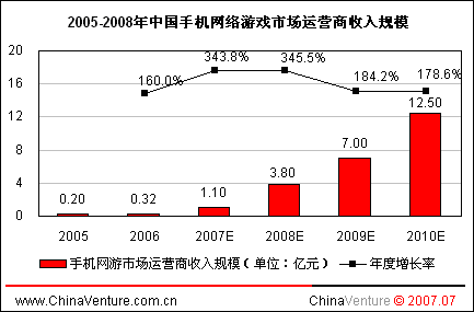 手機網(wǎng)游業(yè)務(wù)經(jīng)過近幾年培育,市場規(guī)模逐步擴大。隨著用戶認(rèn)知度和普及率逐步提高,未來將成為游戲產(chǎn)業(yè)新的增長點。代表手機游戲未來發(fā)展方向的手機網(wǎng)游市場必將在2008年和2009年開始獲得風(fēng)險投資商的廣泛關(guān)注。
