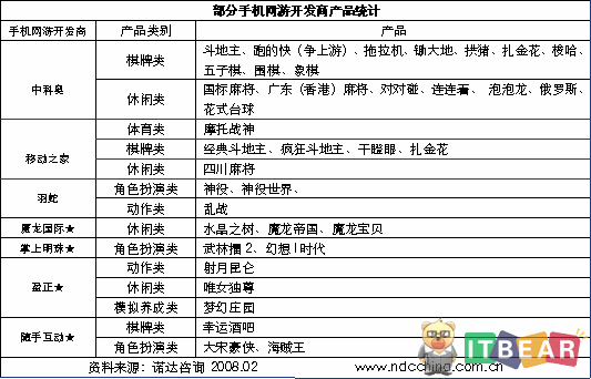 目前國內(nèi)市場上運行的手機網(wǎng)游不下百種,單就手機網(wǎng)游開放來說,國內(nèi)還沒有哪家或哪幾家開發(fā)商控制占據(jù)絕對優(yōu)勢的局面。下表列出了幾家手機網(wǎng)游開發(fā)商開發(fā)的手機網(wǎng)游產(chǎn)品。從表中可以看出中科奧開發(fā)的產(chǎn)品數(shù)量較多(18款),主要產(chǎn)品為棋牌與休閑類小游戲。其他的開發(fā)商開發(fā)的手機網(wǎng)游產(chǎn)品數(shù)量在2—5款之間,多為大型游戲。從游戲品種的不同可以看出主要開發(fā)商的研發(fā)方向有所區(qū)別。