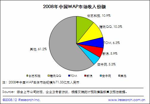 艾瑞咨詢研究發(fā)現(xiàn),08年WAP市場(chǎng)集中度較2007年有所提升,TOP5廠商占據(jù)份額已達(dá)38.8%,其中創(chuàng)意和弦、騰訊QQ、TOM分別以10.9%、10.3%和6.3%的比例位居前三。