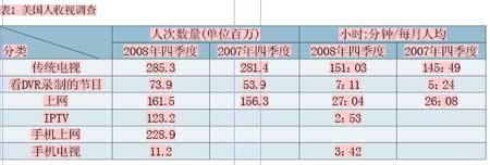 據(jù)Nielsen調(diào)查公司統(tǒng)計,在2008年第四季度,IPTV、DVR(DigitalVideoRecorder)和手機電視增長迅速,其中DVR與手機電視與第三季度相比增長了9%,手機電視的使用人群已達到1100萬人,DVR的使用人群已達到了7400萬人。IPTV在2008年四季度比三季度增長了2.3%,使用人群達到了1.23億。雖然如此,目前傳統(tǒng)電視仍是主流,在美國全國3.06億人口中,有2.85億人是在家看傳統(tǒng)電視,傳統(tǒng)電視2008年四季度增長了300萬,與三季度相比增長了1%。