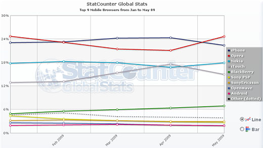 根據(jù)StatCounter的統(tǒng)計(jì)數(shù)字,Opera的移動(dòng)瀏覽器在5月幾乎完全從2009年一到四月每月穩(wěn)定下降三個(gè)百分比的低潮中恢復(fù)過來(lái)了。StatCounter在1月特別點(diǎn)出 Opera在移動(dòng)瀏覽市場(chǎng)的占有24.69%,比這個(gè)月高出0.05%。不論這個(gè)月的使用數(shù)字到底為何,至少數(shù)字回升了,這無(wú)疑是Opera值得驕傲的事。