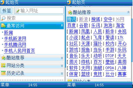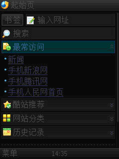 首先,起始頁非常簡潔,只有書簽、網(wǎng)址輸入框、搜索框、最常訪問、酷站推薦、網(wǎng)站分類、歷史紀(jì)錄幾個功能。在酷站推薦中,前幾位是騰訊、新浪、搜狐、空中、3G門戶、百度等常用網(wǎng)址。