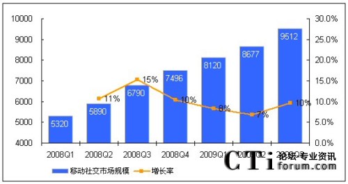 CTI論壇(ctiforum)12月8日消息(記者 楊悅):馳昂咨詢(Sinotes)發(fā)布的《2009年中國移動互聯(lián)網(wǎng)業(yè)務(wù)市場監(jiān)測-第三季度》報(bào)告數(shù)據(jù)顯示,2009年Q3中國移動社交業(yè)務(wù)市場規(guī)模才超過9000萬元,達(dá)9512萬元,直逼億元大關(guān)。與2009年Q2相比,增長率達(dá)10%。預(yù)計(jì)其年增長率將超過30%。