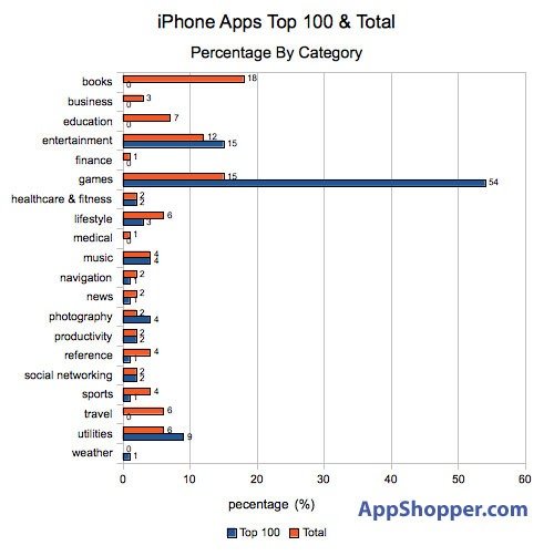 下圖是iPhone和iPod touch的Top100軟件(藍(lán)色)與軟件總數(shù)量(橙色)在各個(gè)軟件類(lèi)別中的分布比例?梢钥闯觯