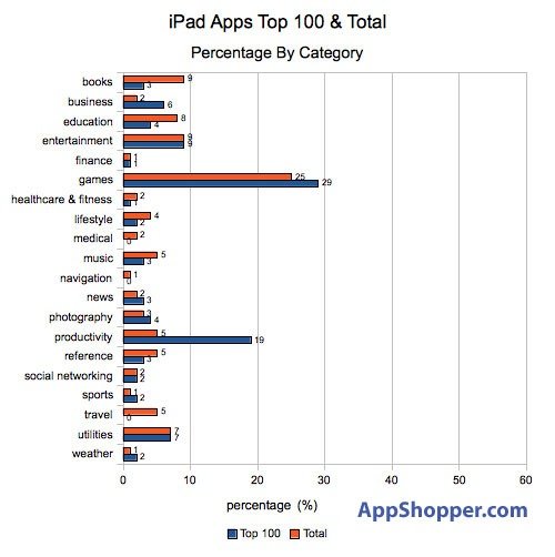而在iPad的Top100軟件與總應(yīng)用數(shù)量在各個(gè)軟件類(lèi)別的分布比例圖中: