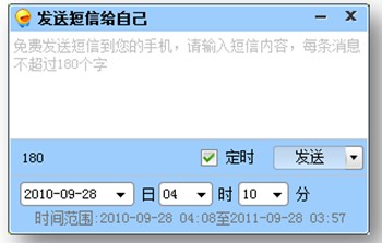 迷你飛信1.0 beta版另一大亮點(diǎn)就是類似于“移動小秘書”的自我短信定時發(fā)送功能。用戶只需直接在好友列表或使用快捷鍵“Ctrl+Alt+W”,就打開了給自己發(fā)送定時短信的窗口。這一功能將滿足用戶通過飛信進(jìn)行“短信提醒”的使用需求。