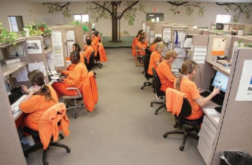 但古德溫邁出了回歸體面人生的艱難步伐,并已獲得了一份工作,4月份刑滿后可上任,這一切都多虧了一家名為威爾帝電信(Televerde)的公司。該公司在佩里維爾監(jiān)獄運營著四個呼叫中心,包括250名輪候上班的身著橘黃色連身衣的“女士”(員工們很享受這個稱呼),員工必須接受脫衣搜查,有時還要接受保安的盤問。但一旦戴上耳機,她們就進入了另一個世界。“在那里可以重拾自尊!惫诺聹乇硎,她已為出獄后的生活攢下了8,000美元的儲蓄。威爾帝電信是一家私營企業(yè),董事長詹姆斯·胡克(James