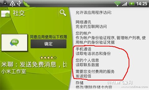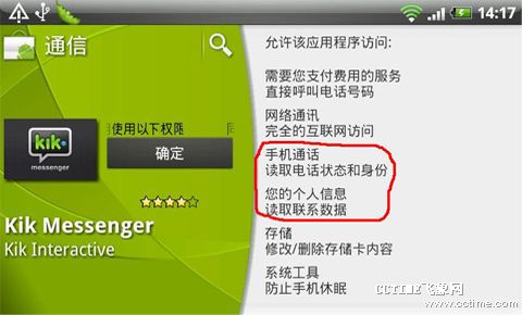 國(guó)內(nèi)外Kik類應(yīng)用也逐漸興起,騰迅最近也加入此陣營(yíng)并推出其下產(chǎn)品微信。Kik類應(yīng)用主要以用戶手機(jī)中聯(lián)系人目錄為主要的關(guān)系抓取,只要其聯(lián)系人中裝入該客戶端,用戶無需特意添加即可開始類似短信的聊天。以KikMessenger為例,其中便涉及讀取用戶聯(lián)系人信息、電話狀態(tài)和身份等權(quán)限。