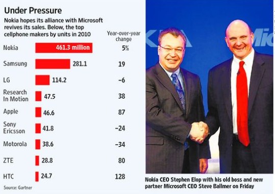 諾基亞不僅是芬蘭最大的公司,在中國(guó),更是締造過(guò)無(wú)數(shù)的神話(huà)。今天在智能手機(jī)市場(chǎng),諾基亞的塞班Symbian系統(tǒng)已經(jīng)被蘋(píng)果iPhone和以摩托羅拉、HTC為首的安卓“部隊(duì)”打得焦頭爛額。雖然它在全球手機(jī)市場(chǎng)的份額上還處于領(lǐng)先地位,但是在利潤(rùn)方面已被蘋(píng)果快速超越。曾經(jīng)以高端形象示人的諾基亞,更多用戶(hù)卻是集中在單機(jī)價(jià)1000元到2000元人民幣的中低端市場(chǎng)。