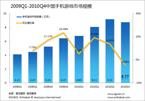 2010年Q4手機(jī)游戲市場(chǎng)規(guī)模8.77億首次出現(xiàn)負(fù)增長