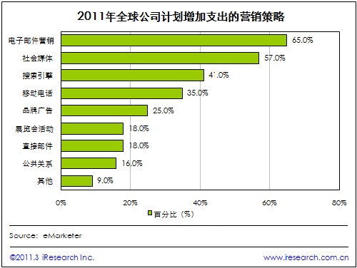 iResearch艾瑞咨詢根據(jù)eMarketer發(fā)布的調(diào)查研究報(bào)告發(fā)現(xiàn),2011年,全球65%的公司將在電子郵件營銷中增加支出,57%的公司愿意在社會媒體營銷中增加開支;而愿意在其他營銷策略增加支出的公司均未超過五成。
