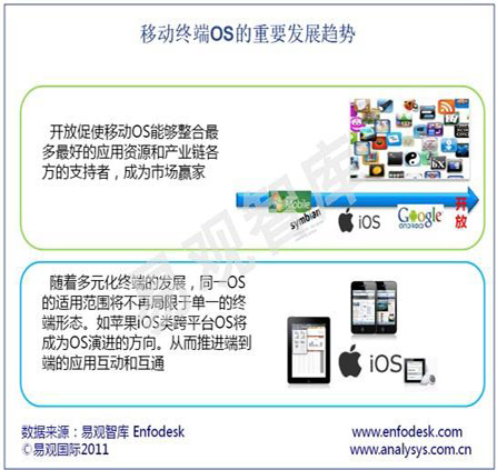 易觀國際(Analysys International)在近期發(fā)布易觀智庫Enfodesk《中國移動互聯(lián)網(wǎng)行業(yè)年度綜合報(bào)告2011》中對于移動終端OS部分進(jìn)行了深入的研究。易觀國際認(rèn)為,隨著3G和移動互聯(lián)網(wǎng)的迅猛發(fā)展,多樣化的移動應(yīng)用體系逐漸形成,促使具有獨(dú)立OS的智能手機(jī)市場規(guī)模不斷擴(kuò)大。移動終端OS作為用戶與終端進(jìn)行交互的操作接口,以及移動應(yīng)用、內(nèi)容、服務(wù)運(yùn)行的平臺,對于移動互聯(lián)網(wǎng)的發(fā)展起著至關(guān)重要的意義。未來在各種形態(tài)移動互聯(lián)網(wǎng)應(yīng)用和服務(wù)爆發(fā)性增長的情況下,移動終端OS生態(tài)圈建設(shè)將走向開放,并促使多元化終端之間的互聯(lián)互通,成為終端發(fā)展的新機(jī)遇。