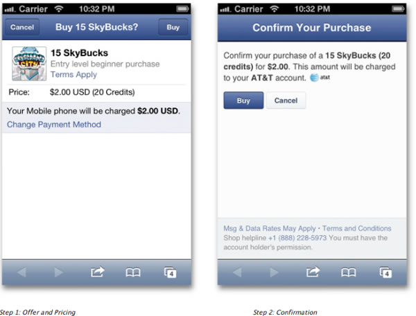 現(xiàn)在,針對(duì)應(yīng)用內(nèi)支付,F(xiàn)acebook聯(lián)合移動(dòng)運(yùn)營(yíng)商推出了便捷的支付服務(wù),允許用戶在購買Facebook應(yīng)用開發(fā)商所提供的服務(wù)、游戲或者升級(jí)服務(wù)時(shí),直接將交易費(fèi)記到電話賬單當(dāng)中。整個(gè)流程被簡(jiǎn)化成2步:首先用戶選擇需要購買的服務(wù),然后打開支付窗口,點(diǎn)擊確認(rèn)即可。