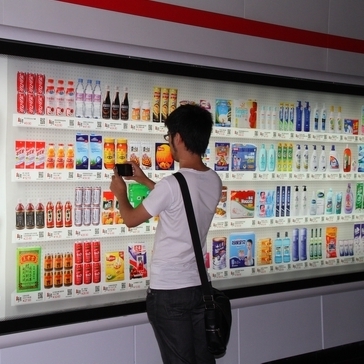 這種虛擬商店消費(fèi)模式如今正漂洋過(guò)海而來(lái),北京移動(dòng)此前就曾推出過(guò)麥當(dāng)勞電子兌換單服務(wù),用戶可以通過(guò)短信接收二維碼,再去麥當(dāng)勞門(mén)店掃描兌現(xiàn)。而細(xì)心的申城用戶如今也能在軌交過(guò)道中發(fā)現(xiàn)這樣的虛擬百貨商店廣告,這些燈箱廣告中出現(xiàn)了超市中才能見(jiàn)到的商品貨架,五顏六色的商品圖案讓人仿佛置身于大型超市一樣,但只有當(dāng)你走近才會(huì)發(fā)現(xiàn)“貨架”竟然是“貼”在墻上的,從零食到衣服,甚至還有尿片,這里每一種產(chǎn)品下方都有相應(yīng)價(jià)格和二維碼。