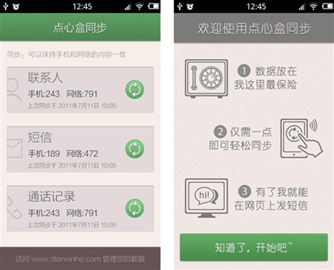 點(diǎn)心盒同步使用十分方便,在手機(jī)上安裝客戶(hù)端,通過(guò)注冊(cè)獲取賬號(hào),登陸后進(jìn)入軟件的主界面,僅需輕點(diǎn)同步按鈕,即可將聯(lián)系人、短信和通話(huà)記錄同步到點(diǎn)心盒網(wǎng)站上。此時(shí),不僅在手機(jī)端,用戶(hù)在云端通過(guò)點(diǎn)心盒網(wǎng)站也可以進(jìn)行聯(lián)系人新建、編輯和刪除的操作,并支持聯(lián)系人導(dǎo)入和去除重復(fù)的聯(lián)系人,方便聯(lián)系人管理。