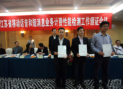 會上,檢測單位公布了移動話音和短消息業(yè)務(wù)計費檢測的相關(guān)標準和本次計費檢測的合格清單。省通信管理局向江蘇電信、江蘇移動、江蘇聯(lián)通共39家地市公司頒發(fā)了移動話音和短消息業(yè)務(wù)計費性能檢測合格證書。