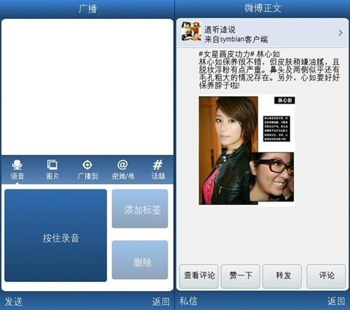 語音微博1.6 for Symbian新加入的私信和經(jīng)驗系統(tǒng)的加入使得用戶間信息的交流更緊密、分享更便捷。從此,千里傳音不是夢。