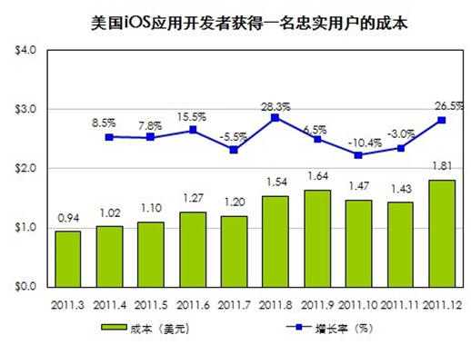 國(guó)際著名APP市場(chǎng)營(yíng)銷組織Fiksu最新的研究數(shù)據(jù)或許能出答案。2011年12月iOS應(yīng)用開(kāi)發(fā)者獲得一名忠實(shí)用戶的成本達(dá)到1.81美元,創(chuàng)下歷史新高。而在2011年第一季度,獲得一名用戶的平均成本為0.94美元,一年間單個(gè)用戶成本翻了一倍。當(dāng)用戶對(duì)蘋果商店里花樣繁多的游戲開(kāi)始麻木,就需要借助有針對(duì)性的推廣策略和強(qiáng)大的執(zhí)行,讓產(chǎn)品脫穎而出。如今忠實(shí)用戶成本的提高,使得幾乎所有開(kāi)發(fā)者乃至小團(tuán)隊(duì)都畏懼前期的市場(chǎng)推廣,大中型開(kāi)發(fā)公司可利用自身的資源循環(huán)造血拉動(dòng)用戶,越是小的開(kāi)發(fā)團(tuán)隊(duì)成功的幾率就越渺茫,而被吞并的可能性則大增。