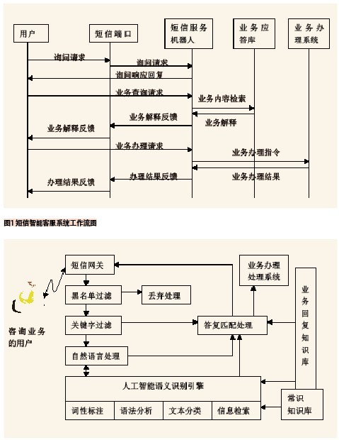 人工智能技術(shù)的引入讓機(jī)器能替代人工服務(wù)為用戶提出的問題和請(qǐng)求做出類人的處理和反饋。在計(jì)算機(jī)系統(tǒng)上實(shí)現(xiàn)人工智能的有兩種不同的方式。一種是工程學(xué)方法,采用傳統(tǒng)的編程技術(shù),使系統(tǒng)呈現(xiàn)近似人類智能的輸出結(jié)果,并不考慮所用方法是否與人或動(dòng)物機(jī)體所用的方法相同。另一種是模擬法,它不僅要獲得類人的輸出結(jié)果,還要求實(shí)現(xiàn)方法也和人類或生物機(jī)體所用的方法相同或相類似。目前主要在工程學(xué)方法實(shí)現(xiàn)人工智能中有較成熟的商用技術(shù),短信自助服務(wù)系統(tǒng)也基于該方法實(shí)現(xiàn)。