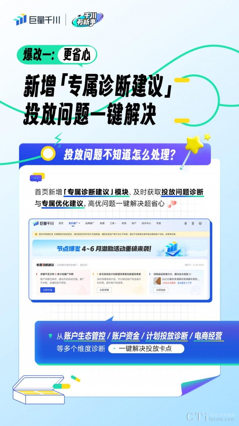近期,為直面商家投放困境,全面提升投放效率,巨量千川PC端首頁(yè)全新推出四大重磅升級(jí)——上線「專屬診斷建議」、「數(shù)據(jù)看板」、「重磅產(chǎn)品推薦」和「平臺(tái)動(dòng)態(tài)」,助力商家更便捷、更從容地提升投放質(zhì)量和效果,高效推動(dòng)生意增長(zhǎng)!