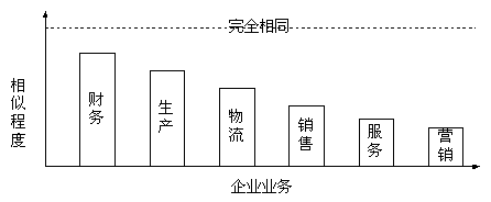 很顯然,企業(yè)間業(yè)務(wù)的相似程度越高,采用商用軟件的有效率越高,企業(yè)在采用商用軟件的時候軟件的客戶化定制就越少,實施的成功率越高。財務(wù)軟件是目前商用軟件通用最有效的企業(yè)管理軟件就是明證。從圖中可以看出前面的幾種業(yè)務(wù),是 傳統(tǒng)ERP軟件支持的功能;而后面的銷售、服務(wù)和市場是目前CRM軟件所要實現(xiàn)的功能。如果說,企業(yè)采用現(xiàn)有的ERP商品套件來滿足企業(yè)運營管理的需要還需要30%的客戶化工作,那么如果采用商用的CRM軟件,軟件廠商提供的軟件要應(yīng)用于企業(yè),就需要更多的客戶化工作,這個比例幾乎接近于企業(yè)自己開發(fā)。