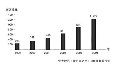 亞太地區(qū)正在成為CRM應(yīng)用軟件的新興市場。1999年亞太地區(qū)CRM市場的年增長率達33.5%。其中中國CRM市場是除日本外最具發(fā)展?jié)摿Φ氖袌。預(yù)計到2004年,中國CRM市場的復(fù)合年平均增長率為60%。