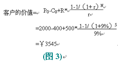 假設(shè)客戶與公司保持交易時(shí)間:N=5年;公司最初吸引每個(gè)客戶的成本(營(yíng)銷費(fèi)用): C0=¥400;客戶第一次購(gòu)買的產(chǎn)品價(jià)格:P0=¥2000;公司期望每年從每個(gè)客戶處增加的收入:R=¥500;利率(一般指貸款利率): r =9%;那么客戶的價(jià)值等于:客戶初次購(gòu)買產(chǎn)品和以后幾年每年消費(fèi)價(jià)值的折現(xiàn)之和,減營(yíng)銷成本,即: