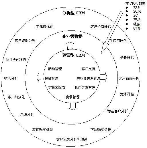 數(shù)據(jù)分析的技術出現(xiàn)要早于數(shù)據(jù)庫,數(shù)據(jù)倉庫和CRM。而且它是不同學科的綜合,包括標準查詢、統(tǒng)計分析以及復雜的預測模型。許多CRM供應商將這些分析(由此稱為“分析型CRM”)融入到CRM產(chǎn)品中,因此為用戶提供的功能不僅可以運作關鍵CRM業(yè)務流程,還可以將商務智能應用到這些CRM功能模塊中,從而使它們更準確、更有價值。