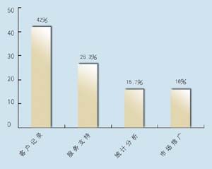 關(guān)于所應(yīng)用的CRM類型,有5家是呼叫中心,5家是分析型,7家是運(yùn)營型,2家是屬于大型企業(yè)CRM。其中13家擁有動(dòng)態(tài)客戶數(shù)據(jù)庫,占到68.4%。這其中又有42%利用數(shù)據(jù)庫作客戶記錄,26.3%作為客戶支持使用,15.7%用作統(tǒng)計(jì)分析,另有16%作為市場推廣。保險(xiǎn)公司與客戶聯(lián)系的方式,從重要性來看依次為:面對面\電話\網(wǎng)絡(luò)\傳真,這說明保險(xiǎn)公司對于與客戶進(jìn)行人性化交流的重視。在問到CRM的主要作用時(shí),有5家表示使用CRM有助于保險(xiǎn)業(yè)了解自身的經(jīng)營情況,幫助公司準(zhǔn)確地發(fā)現(xiàn)贏利客戶和具有贏利潛力的客戶,有7家認(rèn)為使用CRM有助于分析客戶的消費(fèi)傾向,有7家認(rèn)為使用CRM有助于優(yōu)化信息和資源管理。在問到是否愿意為像CRM系統(tǒng)這樣的咨詢或服務(wù)付費(fèi)時(shí),有11家表示愿意,占到57.8%。