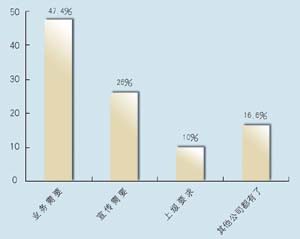 在問到對CRM的熟悉程度方面,有12家表示熟悉,占到63.2%,另有7家表示不熟悉,說明許多企業(yè)已經(jīng)對CRM有一定了解,不過也仍有相當(dāng)大的市場空間。其中有8家建立了CRM系統(tǒng),占到42%,計(jì)劃建立的有9家,占到47.4%,而有2家表示短期不會(huì)建立。從調(diào)查發(fā)現(xiàn),幾乎所有受訪者都接受和認(rèn)同CRM,盡管有一些企業(yè)還不熟悉,但在調(diào)查問卷中對此表現(xiàn)出極大的興趣。在CRM的采購動(dòng)機(jī)上,有9家表示是為了提高業(yè)務(wù),占到將近一半的比例(47.4%),而有5家表示出于企業(yè)宣傳,2家屬于上級主管部門要求,有3家表示是出于同行的示范。調(diào)查顯示,企業(yè)獲得CRM的信息來源很廣,最多的是通過報(bào)刊雜志的廣告,有6家,占31.6%,而上級推薦和供應(yīng)商推薦各有4家,各占21%,有兩家是集成商推薦,此外還有3家通過展會(huì)獲得相關(guān)信息。