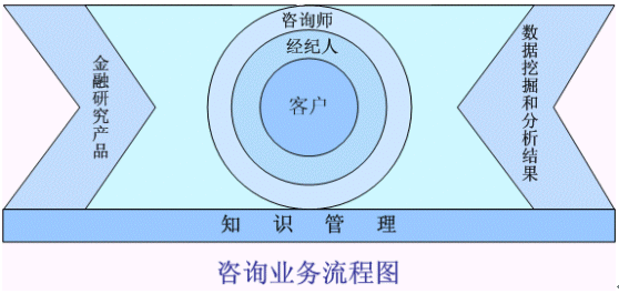 如上圖所示的證券經(jīng)紀(jì)行業(yè)的投資咨詢服務(wù)業(yè)務(wù)流程,是在整體的知識管理的平臺(tái)之上,根據(jù)金融產(chǎn)品的信息通道和數(shù)據(jù)分析和挖掘的基礎(chǔ),由咨詢師和經(jīng)紀(jì)人組成可行性的個(gè)性化服務(wù)小組為核心客戶提供真正的"一對一"投資設(shè)計(jì)和投資咨詢服務(wù)。