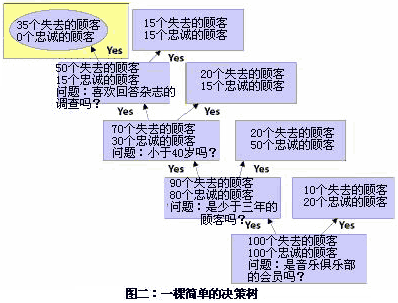 你可以從它的名字中猜到,決策數(shù)是一種樹型分析模型。樹枝代表了用來(lái)定義或者細(xì)分客戶的不同問(wèn)題。比如,假設(shè)一家音樂(lè)俱樂(lè)部想要分析為什么一些會(huì)員不會(huì)再次申請(qǐng)它的會(huì)員資格(該俱樂(lè)部會(huì)員采取月申請(qǐng)制)。為了形成決策樹,公司召集了一批由100個(gè)忠誠(chéng)顧客、100個(gè)非忠誠(chéng)或者已經(jīng)公司已經(jīng)失去的顧客組成的測(cè)試小組。然后,公司開始提出一系列問(wèn)題,要求顧客形容一下忠誠(chéng)的顧客和非忠誠(chéng)的顧客是什么樣子的。整個(gè)決策樹就如圖二所示。