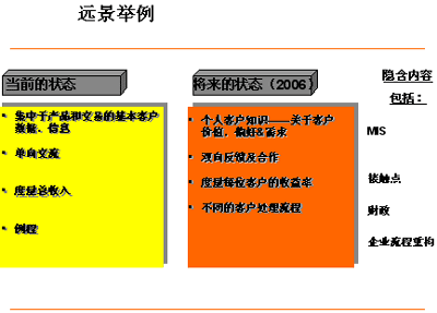 在評(píng)估當(dāng)前情況與遠(yuǎn)景,資源需求,癥結(jié),極限以及鋪就路標(biāo)和里程碑的關(guān)系時(shí),實(shí)施展望和差距分析會(huì)議是十分重要的。取決于你對(duì)CRM遠(yuǎn)景的定義——無(wú)論是它將成為一個(gè)能夠給你一把競(jìng)爭(zhēng)利刃的企業(yè)策略 (類(lèi)似的例子有Citicorp,Dell,F(xiàn)ord Motors) 或僅僅只是一個(gè)讓你更出眾的營(yíng)銷(xiāo)項(xiàng)目——這邁出的第一步在你選擇CRM方法論的過(guò)程中都必將起到舉足輕重的作用。一個(gè)核心的方法論必須能夠支持企業(yè)大部分的業(yè)務(wù)和流程需求,如MIS;客戶體驗(yàn)管理;接觸點(diǎn)管理;收益率管理等等。