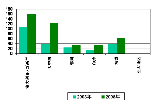 亞太區(qū)(日本除外)的CRM應(yīng)用市場中,澳大利亞繼續(xù)處于主導(dǎo)地位,2003年市場規(guī)模為9,740萬美元,據(jù)IDC預(yù)測,2008年有望增至1.452億美元,未來五年的年復(fù)合增長率將達(dá)到8%。中國以2,580萬美元的CRM應(yīng)用市場收入居其次,且IDC預(yù)測,2008年的市場收入將達(dá)1.086億美元,未來五年的年復(fù)合增長率為33%。此外,中國金融、電信等服務(wù)行業(yè)的市場化,迫使這些行業(yè)為了保持競爭能力而增強(qiáng)CRM技術(shù)的應(yīng)用,這是CRM應(yīng)用在金融和電信行業(yè)的普及、從而帶動中國CRM應(yīng)用市場迅猛增長的原因。另外,進(jìn)駐中國的外資企業(yè)在CRM方面的投入也帶動了需求的增長。亞太區(qū)(日本除外)第三大CRM應(yīng)用市場是韓國,2003年市場收入約為2,500萬美元,2008年有望增至3,390萬美元,未來五年的年復(fù)合增長率6%。