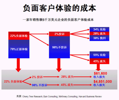 一家年銷售額五千萬美元的企業(yè),假設(shè)正面客戶體驗為78%,負(fù)面體驗為22%,在所有負(fù)面體驗中,只有2%的客戶投訴,其余98%大多數(shù)均不投訴,保持沉默(這與現(xiàn)實情況頗為吻合)。在2%投訴客戶中,有34%經(jīng)過處理仍然未能令客戶完全滿意,尚有流失的危險;28%的客戶在處理后依然流失,余下38%的客戶則感到滿意,繼續(xù)留下。對大部分(98%)沒有投訴的客戶,因公司對他們的不滿意并不知情,所以沒有采取行動,55%的客戶有隨時流失的危險,其余45%已經(jīng)流失。
