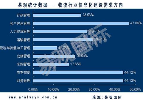 易觀國(guó)際《中國(guó)物流行業(yè)信息化年度綜合報(bào)告2006》數(shù)據(jù)統(tǒng)計(jì),物流企業(yè)選擇管理信息化建設(shè)方向最迫切的需求是客戶關(guān)系管理,占到全部企業(yè)的47%以上。
