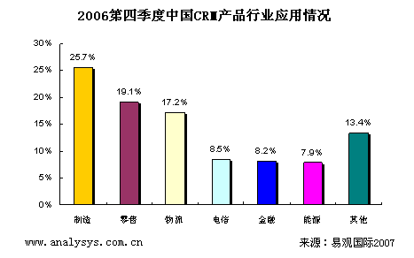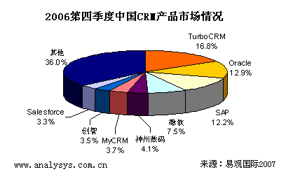 易觀國際研究表明,中國CRM產(chǎn)品市場2006年第4季度總體市場規(guī)模達到0.81億人民幣,季度增長率達到4.2%,體現(xiàn)了穩(wěn)健增長的趨勢。具體廠商方面,TurboCRM,Oracle(甲骨文),SAP位居領(lǐng)先地位。