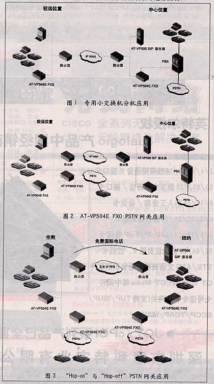 在圖2所示的應(yīng)用中,遠(yuǎn)程局位置直接附加了一個(gè)AT-VP504E FXO裝置,為PSTN提供IP電話網(wǎng)關(guān)服務(wù),IP語音呼叫被轉(zhuǎn)化為模擬格式通過標(biāo)準(zhǔn)電話線路進(jìn)行傳輸。同樣,來自普通電話網(wǎng)絡(luò)的呼入呼叫,也被轉(zhuǎn)化為IP呼叫通過企業(yè)IP網(wǎng)絡(luò)轉(zhuǎn)接。這就使本地PSTN呼叫者,可向企業(yè)或其他目的地打免費(fèi)長途電話。