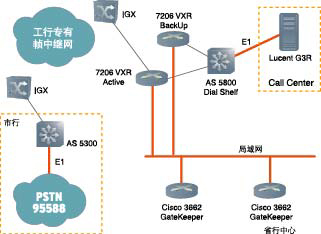 在省行中心,Cisco 7206 VXR路由器上的高速串口接入幀中繼網(wǎng)絡(luò),通過局域網(wǎng)與Cisco 3662語音關(guān)守相連,組成一個基本獨立的網(wǎng)絡(luò)。Cisco AS 5800 Dial Shelf上的E1接口直接連接客戶服務(wù)中心的Lucent公司G3R交換機。市行的語音網(wǎng)關(guān)Cisco AS 5300同樣通過高速串口接入幀中繼網(wǎng)絡(luò),與本地網(wǎng)絡(luò)完全隔離。市行申請的95588數(shù)字中繼線路(多采用ISDN PRI信令)接入AS 5300的E1接口。網(wǎng)絡(luò)拓?fù)鋱D如附圖所示。