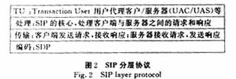 SIP本身是一種分層協(xié)議,如圖2所示。由此可見,SIP采用C/S結(jié)構(gòu),通過MESSAGE機(jī)制來建立會話。因為SIP處理的是客戶端與服務(wù)器之間的請求和響應(yīng),所以SIP消息包括了請求消息和響應(yīng)消息。二者都具有相同的消息格式: