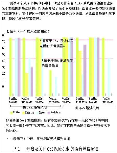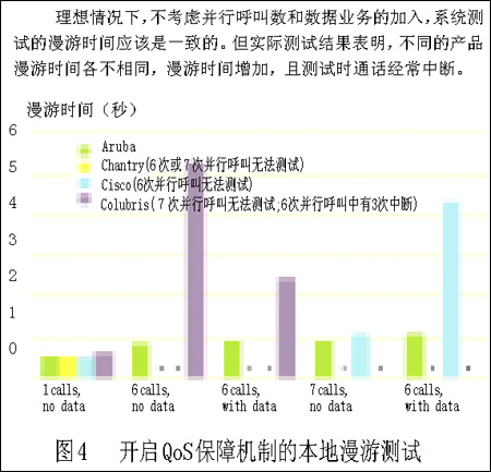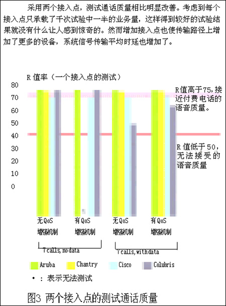 但我們這樣做是合理的。首先,Chantry和Colubris的設(shè)備甚至在建議內(nèi)的6個(gè)并行VoIP呼叫情況下,也無法正常通話。第二,Aruba的設(shè)備能夠處理7個(gè)并行VoIP呼叫并能適應(yīng)加入數(shù)據(jù)流業(yè)務(wù)的情況。第三,我們最有難度的試驗(yàn)也遠(yuǎn)低于無線傳輸媒介的最大負(fù)載。我們?cè)囼?yàn)通常低于3Mbps的通信傳輸速度(包括試驗(yàn)中的所有語音和數(shù)據(jù)業(yè)務(wù)),更遠(yuǎn)低于無線信道的容量了?傊琕oWLAN系統(tǒng)可以實(shí)現(xiàn)在單接入點(diǎn)承載7個(gè)并行VoIP呼叫并加入數(shù)據(jù)通信業(yè)務(wù),但要做到這一點(diǎn)需要更完善的系統(tǒng)設(shè)計(jì)和產(chǎn)品性能。