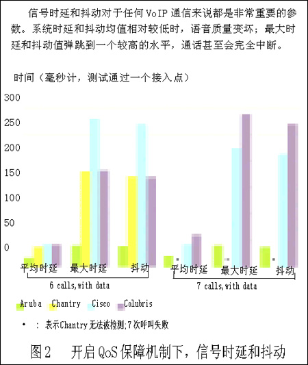 而當(dāng)我們通過一個(gè)接入點(diǎn)或交換機(jī)傳送6到7個(gè)并行VoIP呼叫時(shí),尤其是加入了數(shù)據(jù)通信業(yè)務(wù)后,所有產(chǎn)品的系統(tǒng)性能顯著降低。另外,當(dāng)開通7個(gè)并行VoIP呼叫和關(guān)閉QoS保障機(jī)制時(shí),即使沒有加入數(shù)據(jù)業(yè)務(wù), Colubris設(shè)備也幾乎都處于通話中斷的狀態(tài)。因此,我們無法得到任何測(cè)試數(shù)據(jù)(如圖1所示)。