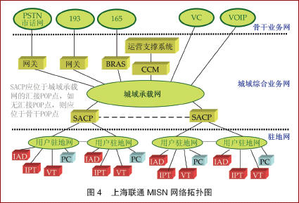 上海聯(lián)通MISN由5個部分組成(見圖4):(1)業(yè)務接入控制設備(SACP)。從用戶駐地網(wǎng)到城域網(wǎng)和骨務都必須通過SACP接的接入認證、業(yè)務接入控制、網(wǎng)絡資源管理和服務質量控制等。(2)呼叫管理控制模塊(CCM)。該模塊負責對用戶注冊的管理;通過SACP對業(yè)務接入進行認證和控制;與骨干業(yè)務網(wǎng)GK互通,完成各種業(yè)務的呼叫控制;與SACP一起采集計費信息;負責控制語音和視頻媒體流的接入。(3)業(yè)務網(wǎng)關。聯(lián)通MISN是基于IP的分組網(wǎng),與基于電路交換的193長途電話骨干網(wǎng)和本地PSTN市話網(wǎng)互通時,由于媒體層面和控制信令層面都不同,因此,需要通過網(wǎng)關進行互通。(4)BRAS設備。負責將互聯(lián)網(wǎng)接入到165網(wǎng)。(5)業(yè)務運營支撐系統(tǒng)。該系統(tǒng)包括維護網(wǎng)管系統(tǒng)、用戶終端管理系統(tǒng)、用戶管理(業(yè)務受理、用戶信息管理、用戶業(yè)務授權與認證)以及本地MISN的計費/營賬系統(tǒng),其對上的接口是各骨干業(yè)務網(wǎng)的運維支撐系統(tǒng)。