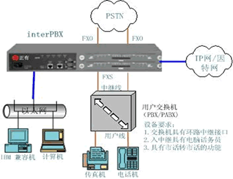 根據(jù)電話交換機的配置和功能不同,電話交換機與 interPBX設(shè)備的連接方式有二種常見方式,下面結(jié)合示意圖來具體說明。