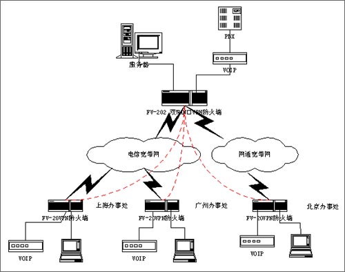 VPN防火墻網(wǎng)關具有雙WAN口和QOS帶寬管理功能,總部同時接入兩條ADSL線路,通過策略路由,把內部網(wǎng)絡的上網(wǎng)訪問全部從WAN2的ADSL上網(wǎng),而把VOIP和VPN全部通過WAN1的ADSL來傳輸,從而避免了上網(wǎng)的請求占用VPN和VOIP的帶寬。同時,通過對內部網(wǎng)絡不同的業(yè)務劃分不同的優(yōu)先級,特別是把VOIP的優(yōu)先級做為最高,優(yōu)先轉發(fā)VOIP的數(shù)據(jù)包,同時又通過VOIP和VPN傳輸分配最大和最小的保證帶寬,來保護VOIP業(yè)務的正常通信。除此之外,F(xiàn)V-202強大的訪問控制功能,特別是對VPN隧道的訪問控制功能,可以對各地的分公司通過VPN訪問總公司的服務器進行控制,為不同的客戶分配不同的權限,讓遠程的VPN隧道只能訪問指定的IP地址或相關的業(yè)務端口,能很好保證VPN的訪問安全。特別值得一提的是,F(xiàn)V-202支持網(wǎng)通、電信雙線路接入,如果由于北方網(wǎng)通跨網(wǎng)接入,可以在全部申請網(wǎng)通線路,把北方的分支機構接入到總部的網(wǎng)通線路,可以避免由于跨網(wǎng)帶來的帶寬瓶頸。在各個分支機構配置iRouter的FV-20VPN防火墻,為各個分支機構構建一道安全的防線,實現(xiàn)與總部的VPN的聯(lián)接。同時,外出的員工或領導通過IPSEC的撥號軟件,實現(xiàn)移動的接入,通過VPN,東莞奧愛斯構建全國的融合的安全通信平臺,既可以解決VOIP的被竊聽的風險,又能實現(xiàn)實時的數(shù)據(jù)訪問。從而大大地降低公司長途的話費和以往租用數(shù)據(jù)專線的高昂的費用,提高了公司的工作效率,為公司帶來十分明顯的經(jīng)濟效益。