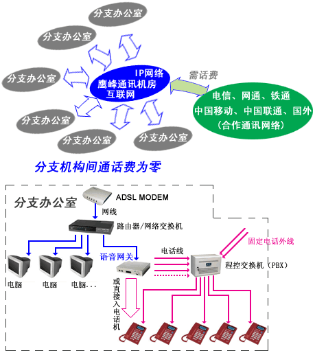 針對以上現(xiàn)狀,鷹峰NGN組網(wǎng)方案協(xié)助A公司在中國總部進行了周密的分析與考察并就相關(guān)的產(chǎn)品技術(shù)進行了深入的研究與探討,提供了以A公司在中國現(xiàn)有數(shù)據(jù)專網(wǎng)為基礎(chǔ)的,融合語音通信的解決方案,這是一套充分利用A公司現(xiàn)有數(shù)據(jù)網(wǎng)絡(luò)資源優(yōu)勢,可行、先進、完整的企業(yè)VoIP通信解決方案。將最終以A公司目前在中國所有機構(gòu)為結(jié)點,組成在中國的VoIP網(wǎng)絡(luò)。方案匯集了鷹峰通訊所有最新PBX/語音網(wǎng)關(guān)及網(wǎng)絡(luò)通訊技術(shù)及設(shè)備,保護了原有的交換機資源,不改變撥號習(xí)慣,體現(xiàn)了非常可觀的經(jīng)濟效益,并且實現(xiàn)了快速實施,將投入的時間,資金縮到了最小。