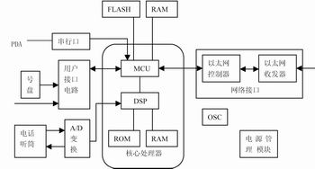 它的開發(fā)基于Atmel公司的AT75C220開發(fā)板。AT75C220是專為各種因特網(wǎng)應用而設計的高性能處理器芯片。它的核心部件—ARM7TDMI微處理器運行能力為40MIPS,專門用于話音處理的OakDSPCore協(xié)處理器(圖2中的話音處理芯片),運行能力可達60MIPS。兩者之間信息的交互采用高效的雙端口mailbox機制。這就決定了AT75C220能綜合通用CPU的控制功能和專用CPU的信息處理功能,提高了系統(tǒng)的集成度,同時ARM處理器的操作指令比較簡單,降低了開發(fā)的復雜度。