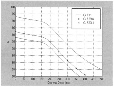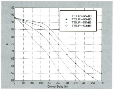 Datagram Protocol)協(xié)議進行傳輸[1]。近年來,隨著IP網(wǎng)絡技術的廣泛應用,VoIP成為一種新興的電話通信方式,IP網(wǎng)絡所提供的語音質量問題受到人們的普遍關注,如何對語音質量進行科學可靠的測量和評價是網(wǎng)絡測量和網(wǎng)絡規(guī)劃設計中十分關鍵的問題。E-Model作為語音質量測量的一種新方法,它適合數(shù)據(jù)網(wǎng)絡的語音質量測量,必將有廣泛的應用。本文將在E模型下分析延時、噪聲、回音和語音壓縮等對VoIP語音質量的影響。
