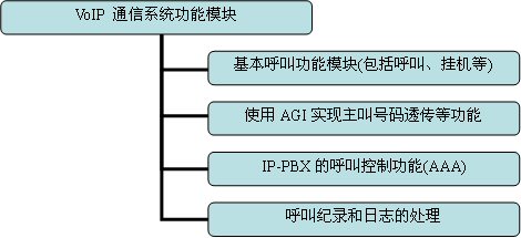如果是基于純軟件的實現(xiàn)方案,Asterisk是構(gòu)建VoIP項目的核心,系統(tǒng)中所有與用戶呼叫有關(guān)的功能和管理都通過它來實現(xiàn),包括VoIP各種協(xié)議的互通和配置,以及各種呼叫設(shè)備的配置文件。本文檔所討論的VoIP通信系統(tǒng)基本功能如圖3-2所示,一般的Asterisk的任務(wù)包括了兩方面,一是與呼叫有關(guān)的,包括基本呼叫處理、主叫號碼透傳、呼叫紀(jì)錄和日志生成等,二是與呼叫控制有關(guān),即終端用戶的認(rèn)證計費(fèi)功能。